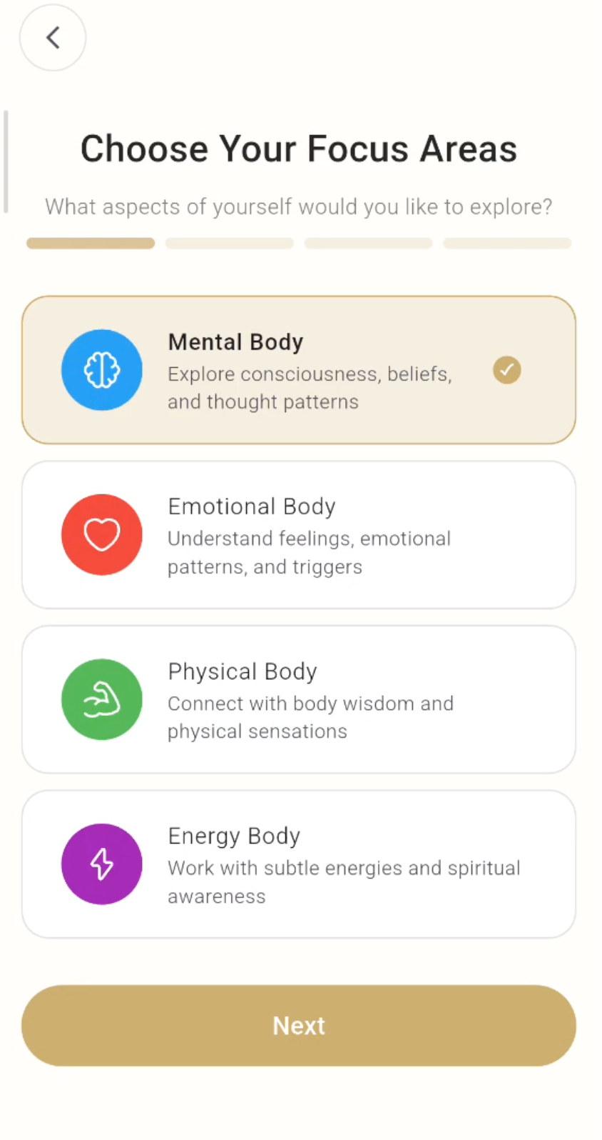Your practice is fully customizable. Select the types of content that resonate most—wisdom quotes, guided exercises, meditation content, community discussions, journal prompts, or scientific insights. Set your weekly engagement level, from a light rhythm of a few exercises to a deeper, more immersive practice. Choose the aspects of yourself you want to explore right now: the Mental Body, the Emotional Body, the Physical Body, the Energy Body, or any combination.