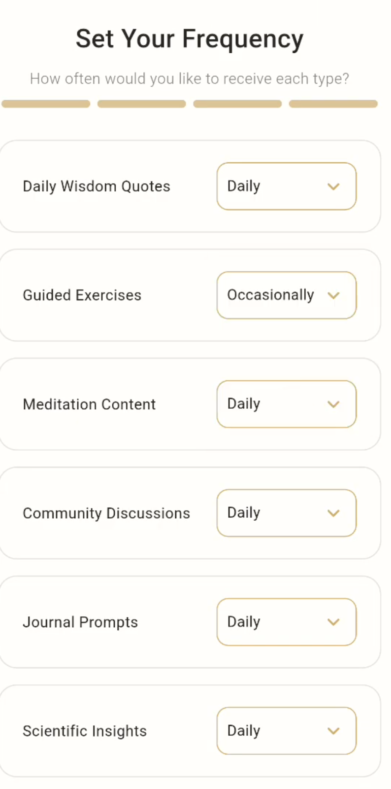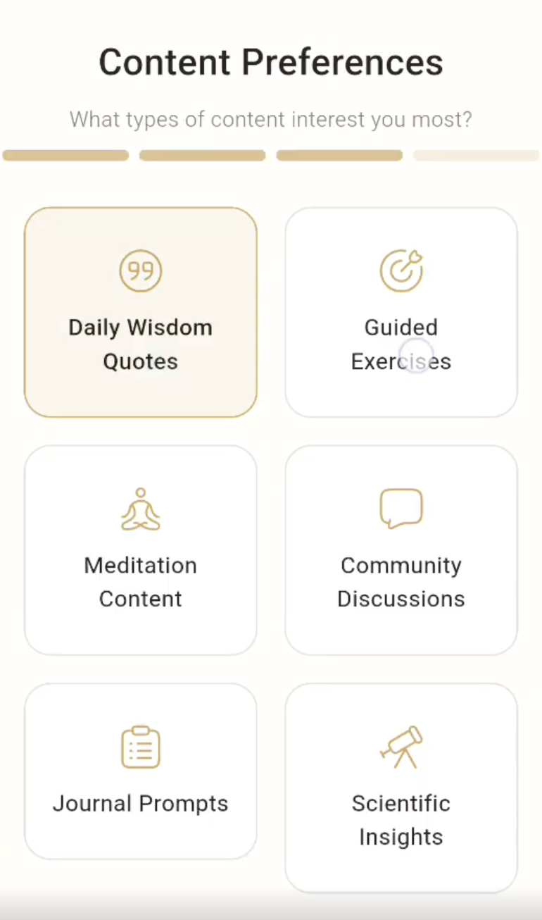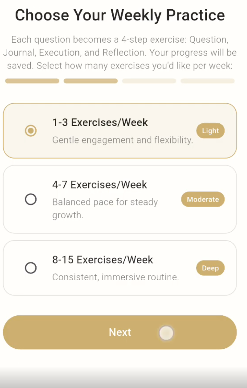Your practice is fully customizable. Select the types of content that resonate most—wisdom quotes, guided exercises, meditation content, community discussions, journal prompts, or scientific insights. Set your weekly engagement level, from a light rhythm of a few exercises to a deeper, more immersive practice. Choose the aspects of yourself you want to explore right now: the Mental Body, the Emotional Body, the Physical Body, the Energy Body, or any combination.